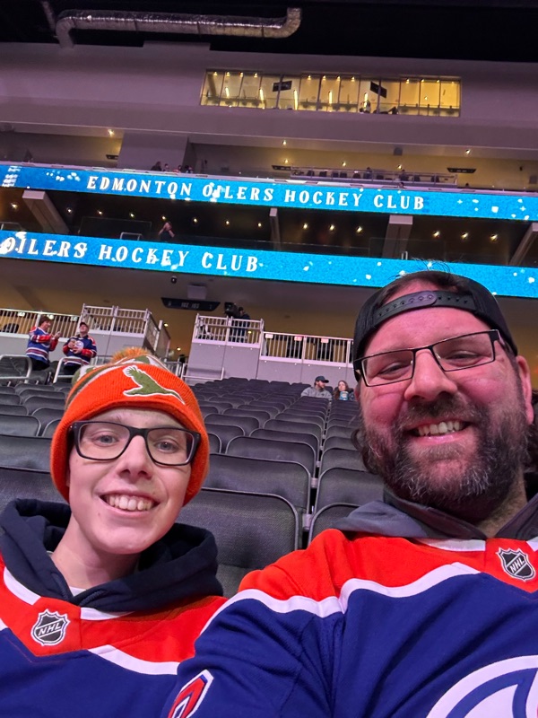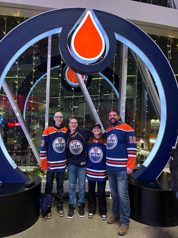 Thankfully Drew and Seth were only down and out for that one day when I posted last. Typically Seth needs a day and a half after chemo treatment to feel good again.  Thursday night he went to yet another Oiler game so he made sure he was well rested for that.πŸ˜‰  The KWCS (Kids with Cancer Society) was also giving away pairs of tickets the day of the game, so we got 2 more and Seth's siblings, Hailey and Drew, also got to go.  Seth and Bryan's seats were 5th row behind the Visitors bench, so that was pretty great! They went early enough to the game to take their time walking to their seats. Seth said he had to sit down about 5 times to take a break. We are thankful he's not trying to be a hero and is making sure he advocates for himself and what he needs.