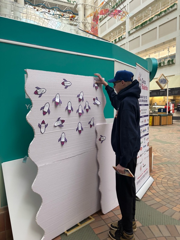 | The Stollery Radiothon was going on while we were at the Stollery. Seth was encouraged to write a little piece of his story on a rocket ship and put it on this board. |